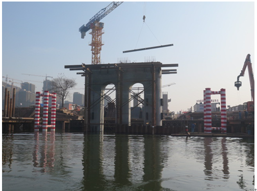 沙颍河QL-03标主桥主墩墩柱共6根,位于沙颍河河道两侧,高22.5m,其中水下部分10.0m,中墩为3.0×3.0m方形柱,边墩为半圆形墩柱,尺寸为R180cm×3m×3m。自5月份开始钢平台施工以来,在公司的指导和帮助下,项目部全体职工齐心协力,先后克服了24m钢板桩插打困难、围堰内基坑开挖深度大(开挖达12m)、下部结构受钢板桩围堰内围