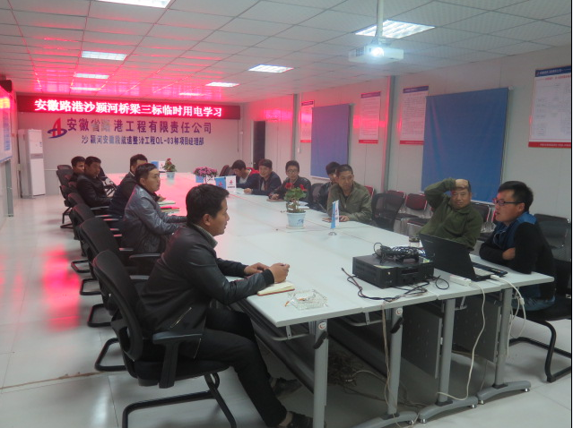 4月16日晚上、17日晚上,沙颍河QL-03标项目部在会议室组织学习«安徽省路港工程有限责任公司规章制度汇编2016版»和«临时用电制度»。