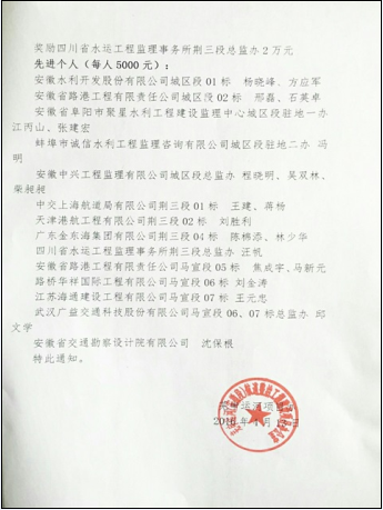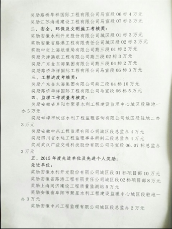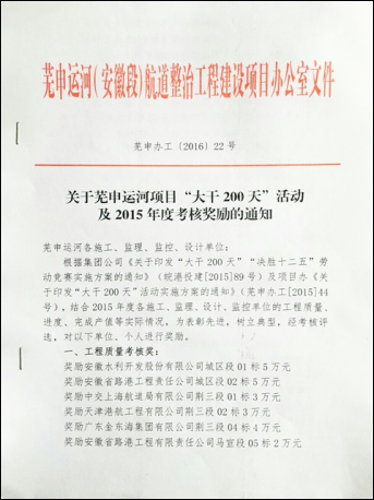 芜申运河城区段02标2015年在工程质量、工程进度、完成产值都圆满完成业主计划进度目标,获得业主2015年度工程质量考核奖5万元、安全环保及文明施工考核奖3万元、先进单位奖励8万元,同时邢磊同志、石英卓同志因表现突出,分获先进个人奖励5000元,共计17万元。