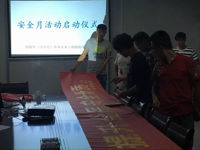 为认真开展以“强化安全发展观念,提升全民安全素质”为主题的2016年第十五个全国“安全生产月”活动,推动项目安全发展,6月8日晚,S202线(涡阳段)路面改善工程项目部组织全体员工,在项目部会议室举行了“安全生产月”启动仪式及签名宣誓活动。