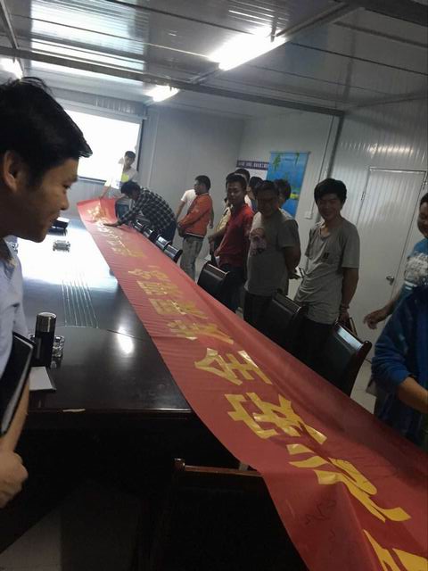 会上,项目负责人宣读了公司安全生产月活动方案,针对“安全月”主题活动、安全管理重点和一岗双责的责任做出了安排和部署,要求项目部全体员工以本次活动为契机,全面开展安全隐患排查,为项目安全生产保驾护航。项目部全体员工都在2016年安全月主题横幅上签上了各自的名字,在项目部安全部负责人的带领下将安全誓词铿锵有力地喊出,也将我要安全、我会安全、我能安全的安全信念印在了自己心底。