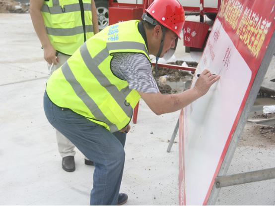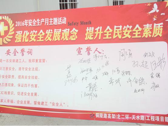 为响应全国“安全生产月”活动号召,6月22日下午,合肥市铜陵路高架项目部全体职工在公司安全管理部经理凌必胜的带领下,开展“安全生产月”宣誓签名仪式。