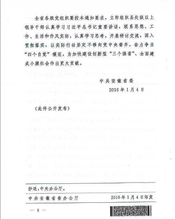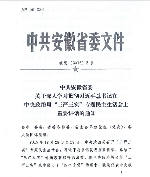 中共安徽省委关于深入学习贯彻习近平总书记在中央政治局“三严三实”专题民主生活会上重要讲话的通知