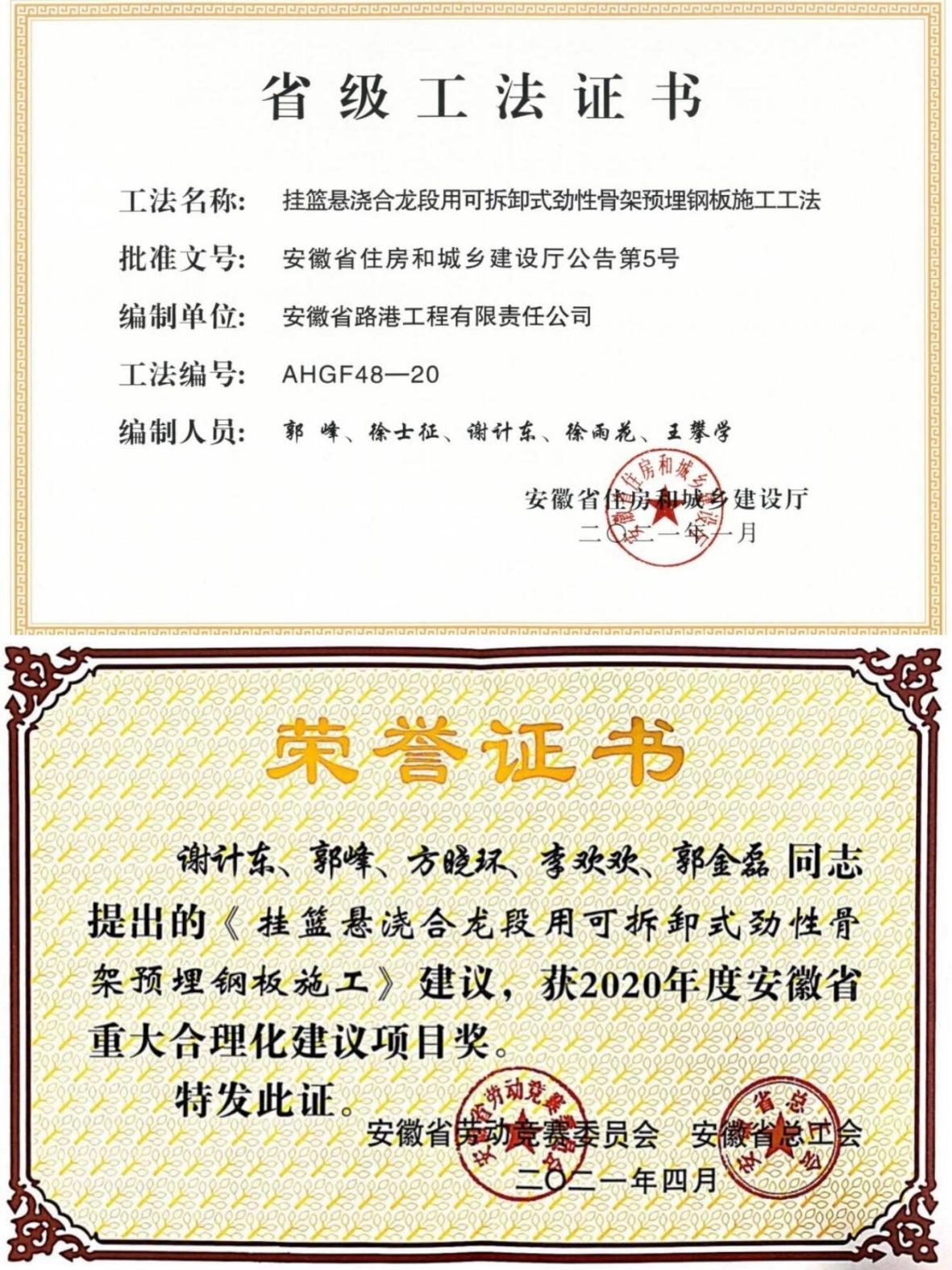 在芜湖市中山桥项目,他积极配合项目经理及总工参与《双趸船转换顶推施工工艺》讨论研究,该工艺获得多项国家级工法、省级工法、省重大合理化建议,该项目荣获中国钢结构金奖、黄山杯等奖项。