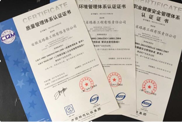 近日,安徽省路港工程有限责任公司顺利通过质量、环境、职业健康安全管理体系再认证。该证书的获得标志着我公司管理体系运行有效、适宜、受控,符合现行的质量、环境、职业健康安全标准要求。