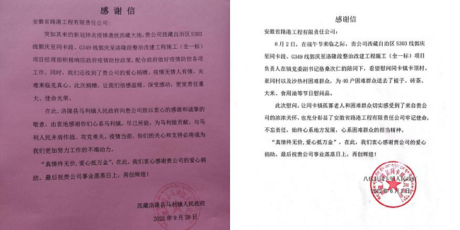 “开拓幸福路,连接名族心”。曹焱良同志多次带领项目部职工看望慰问当地卡顶村、亚同村以及沙热村等困难群众,为40余户困难群众送去了被子、砖茶、大米、食用油等慰问品,给孤寡老人和困难群众带去了浓浓的关怀。8月初,新冠肺炎疫情袭扰西藏大地,曹焱良同志多次带领项目部员工慰问了坚守在疫情防控一线的工作人员,为他们送去了矿泉水、饮料、方便面、食用油、大米、防疫物资及生活必需品,帮助他们解决燃眉之急。通过多次爱心捐赠活动,让当地政府及人民群众深深感受到了公司尽己所能,为西藏做贡献,与西藏人民并肩作战、攻克难关,用实际行动践行了安徽路港国企担当。