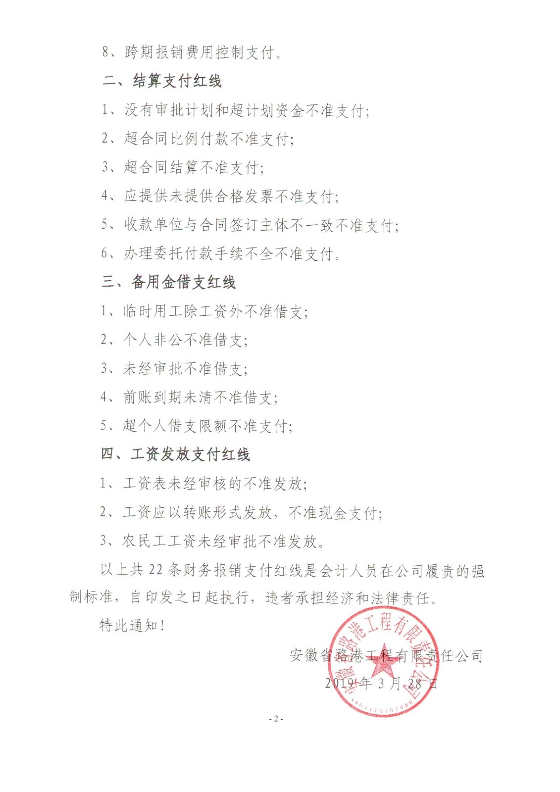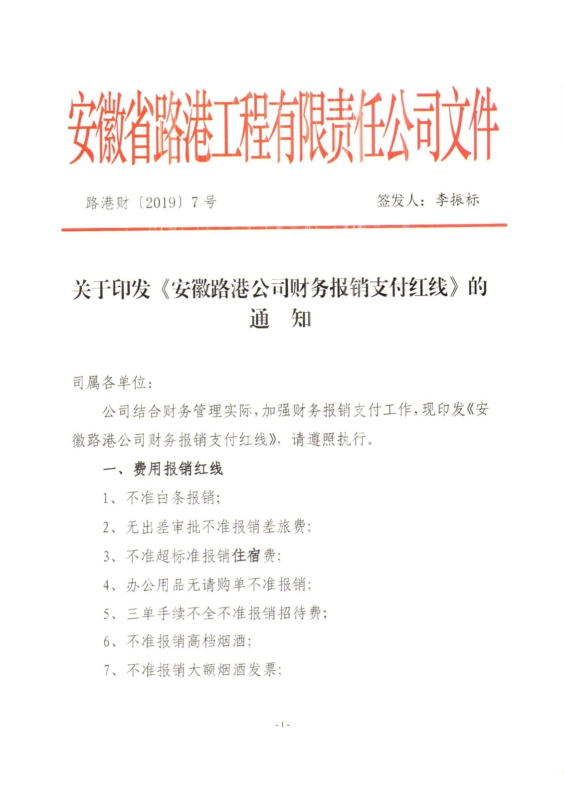 关于印发《安徽路港公司财务报销支付红线》的通知