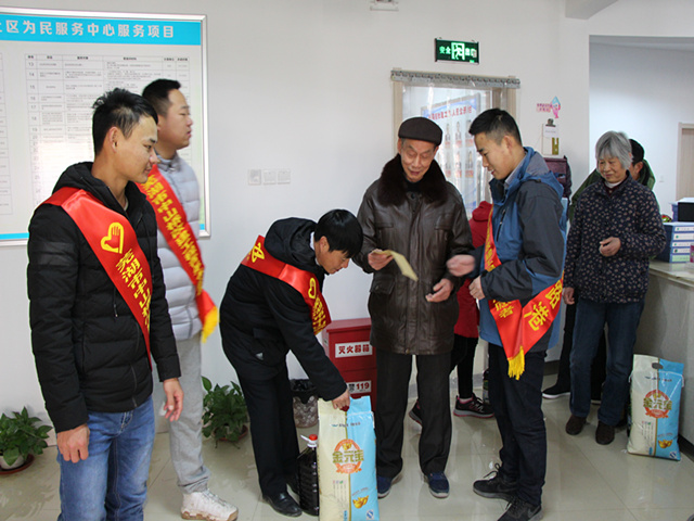 上午9时,在芜湖市弋江区兴隆街道居委会的安排下,项目部青年志愿者们来到弋江区兴隆街道办事处,为孤寡老人、贫困家庭送上菜籽油、大米、慰问金以及新年祝福。青年志愿者们悉心询问他们的家庭境况和身体情况,并嘱咐老人们季节变化要注意保暖,行动要注意安全,志愿者们真诚的问候让老人们感受到了浓浓的温情。