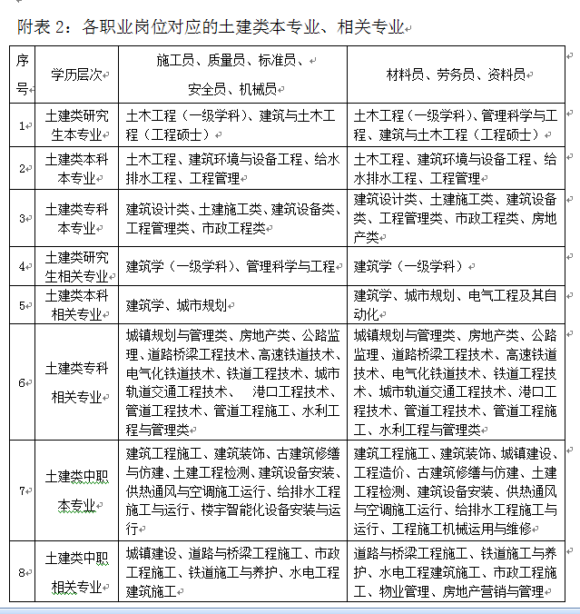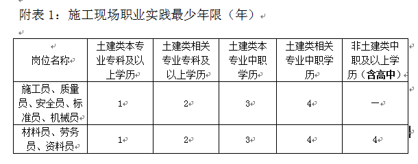 有关专业要求,执行《建筑与市政工程施工现场专业人员职业标准》的规定。详见以下附表1和附表2: