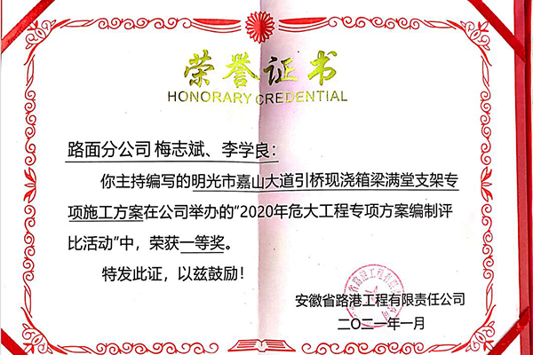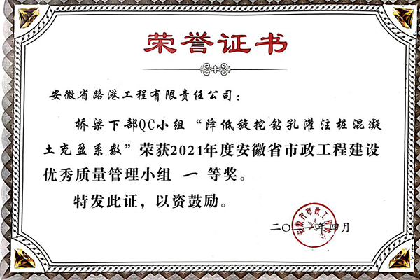 在项目建设期间,多次作为明光市重点推荐项目接受上级政府部门和社会组织检查、参观,同时多次接待省内其他施工单位、公司内部单位的参观、交流。在2020年度明光市交通系统在建工程优秀评选和公司优秀评选中,项目部多名同事荣获“优秀个人”荣誉。梅志斌、李学良组织编制的《引桥现浇梁盘扣式支架现浇专项方案》也荣获公司2020年度专项方案评选一等奖。开展的QC课题《降低旋挖钻孔灌注桩混凝土充盈系数》分别荣获2020年度安徽省工程建设质量管理小组和安徽省市政工程建设优秀质量管理小组一等奖。
