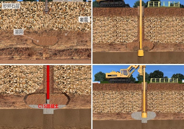 安徽路港公司联合合肥工业大学成立了科研攻关团队,攻关团队通过物理试验、数值分析、现场验证等多方面的深入探究溶洞型桩基的承载机理及风险控制关键。基于试验-理论-实践交叉验证,实现多参数耦合条件下量化钢套筒护壁施工过程优化,提出“快速均匀钻进,成桩护壁协同”新工艺,并建立复杂岩溶地质区桩基施工现场风险管控系统。岩溶区桩基施工完善的安全风险与管控决策的理论体系及明确的管控措施确保了在最低承载要求的基础上,最大限度减少塌孔缩孔灾害,首根岩溶区桩基施工的平稳推进顺利完成,吹响了岩溶区全线桩基施工的“号角”。