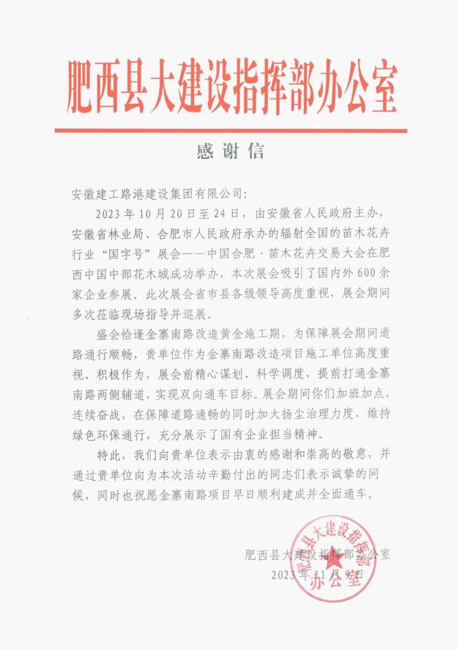 近日,金寨南路(站前路-深圳路)快速化改造2标项目收到肥西县大建设指挥部感谢信,信中对项目在2023年中国合肥•苗木花卉交易大会举办期间的大力配合表示感谢。