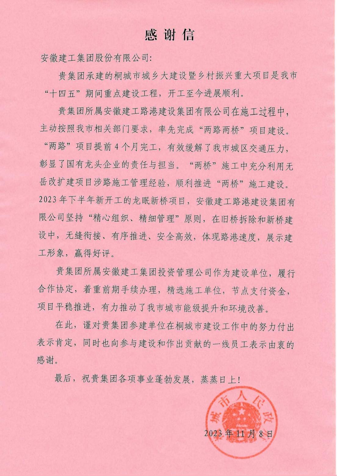 日前,桐城市人民政府给公司送来感谢信,对建工路港在桐城市建设工作中的努力付出表示肯定,向参与建设和作出贡献的一线员工表示由衷的感谢。